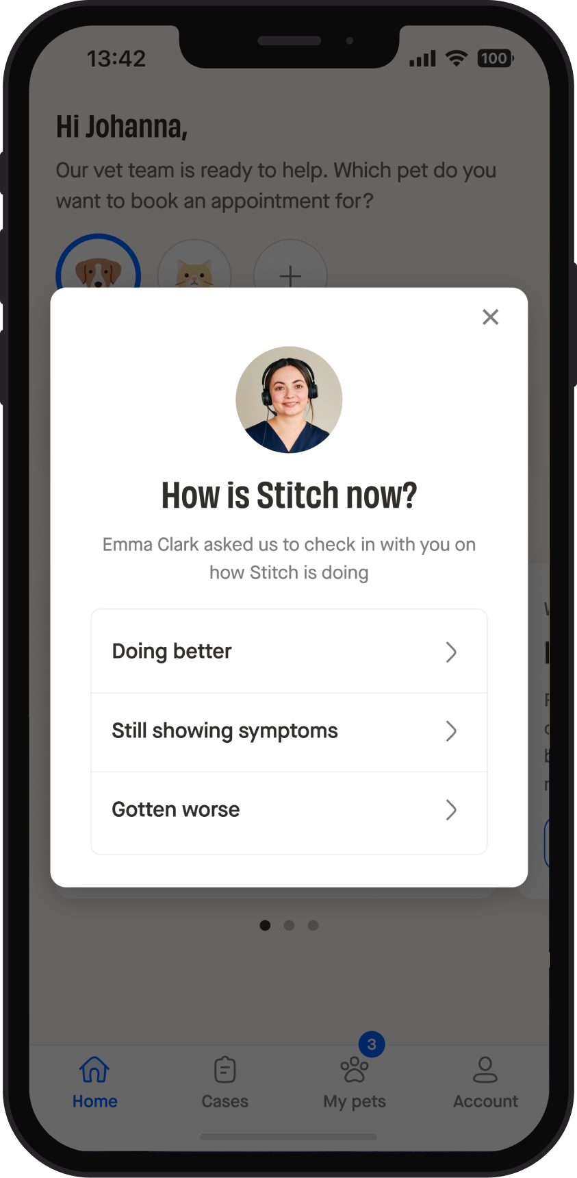 Få råd eller henvisning af en erfaren dyrlæge via videokonsultation. Du får en SMS-påmindelse kort før konsultationen starter.