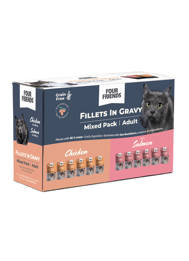 Adult in Gravy Mix 12-pack Våtfoder till Katt från FourFriends är ett komplett och balanserat helfoder för vuxna katter, framtaget för att ge både fantastisk smak och optimal näring i varje måltid. Förpackningen innehåller 12 portionspåsar med saftiga filébitar av kyckling och lax i smakrik sås, perfekt anpassat för kattens naturliga preferenser.