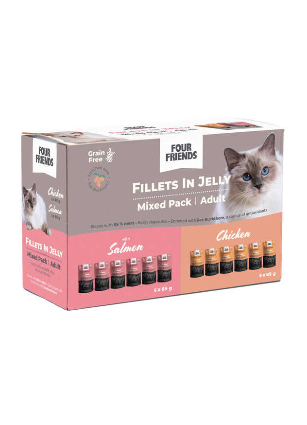 Adult in Jelly Mix 12-pack Våtfoder till Katt från FourFriends är ett komplett och balanserat helfoder för vuxna katter, framtaget för att ge både fantastisk smak och optimal näring i varje måltid. Förpackningen innehåller 12 portionspåsar med saftiga filébitar av kyckling och lax i gelé, perfekt anpassat för kattens naturliga preferenser.