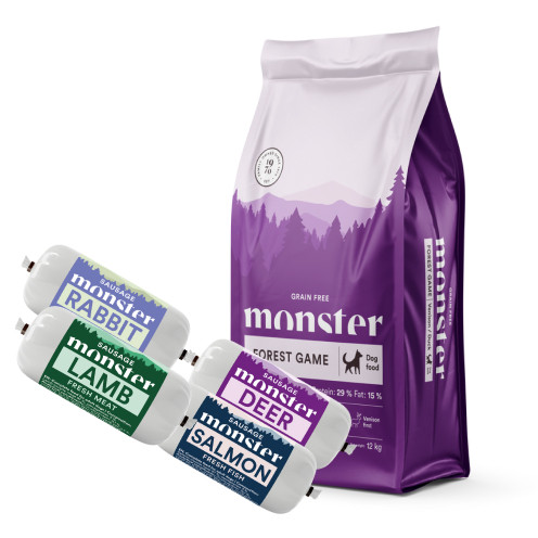 Kampanj! Köp Monster Dog Grain Free Forest Venison & Duck hundfoder och få 1 valfri 80 g Dog Sausage på köpet! Dog Sausage är en kladdfri köttkorv som går utmärkt att skära upp till perfekta belöni...