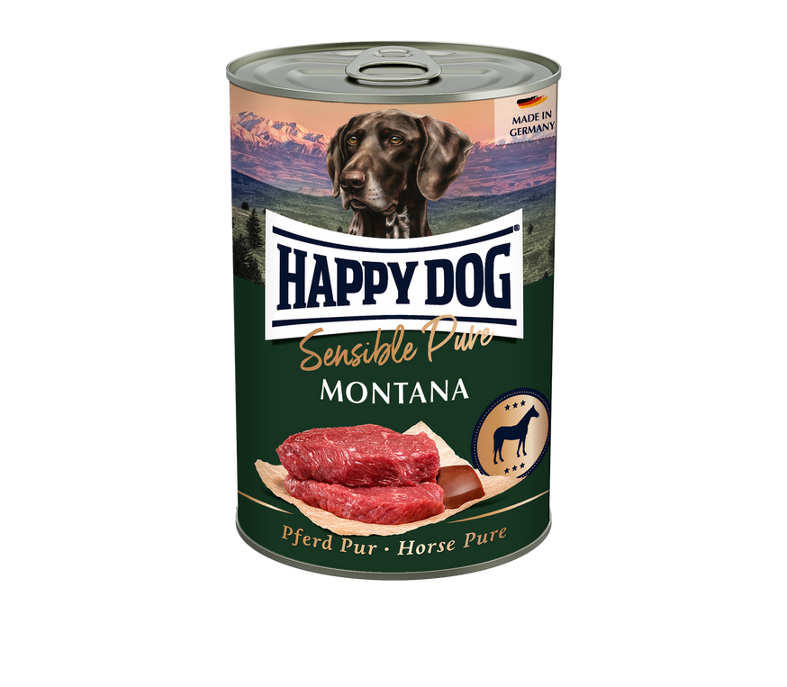 Happy Dog Sensible Puré Montana Häst är ett våtfoder särskilt anpassat för vuxna hundar av alla raser som har foderkänslighet eller allergier.